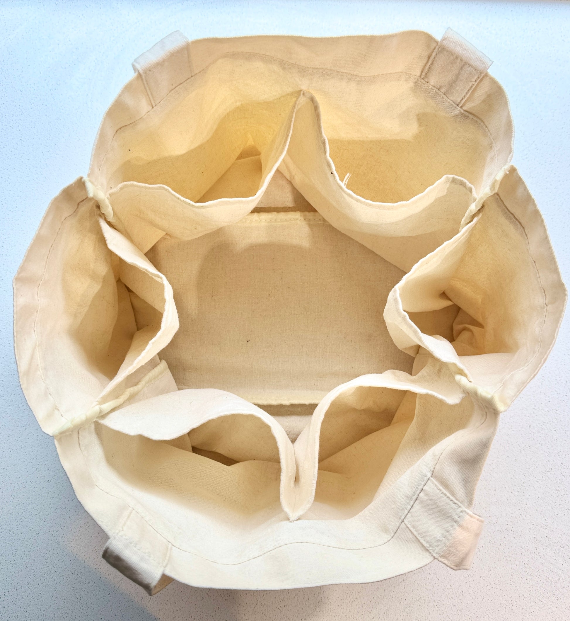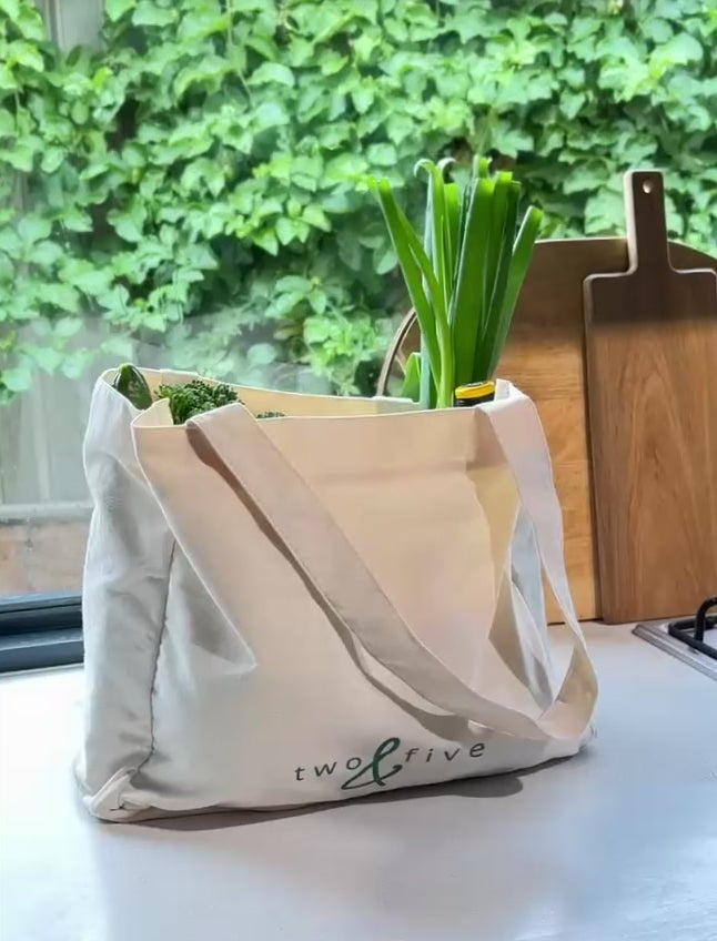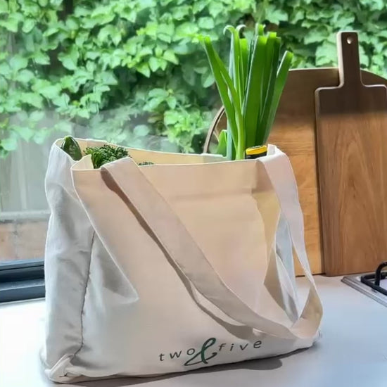 Our large pocket tote designed with plastic-free and hands-free shopping in mind. Made from recycled cotton in a natural colourway it’s the only bag you’ll need to keep everything neat and organised.